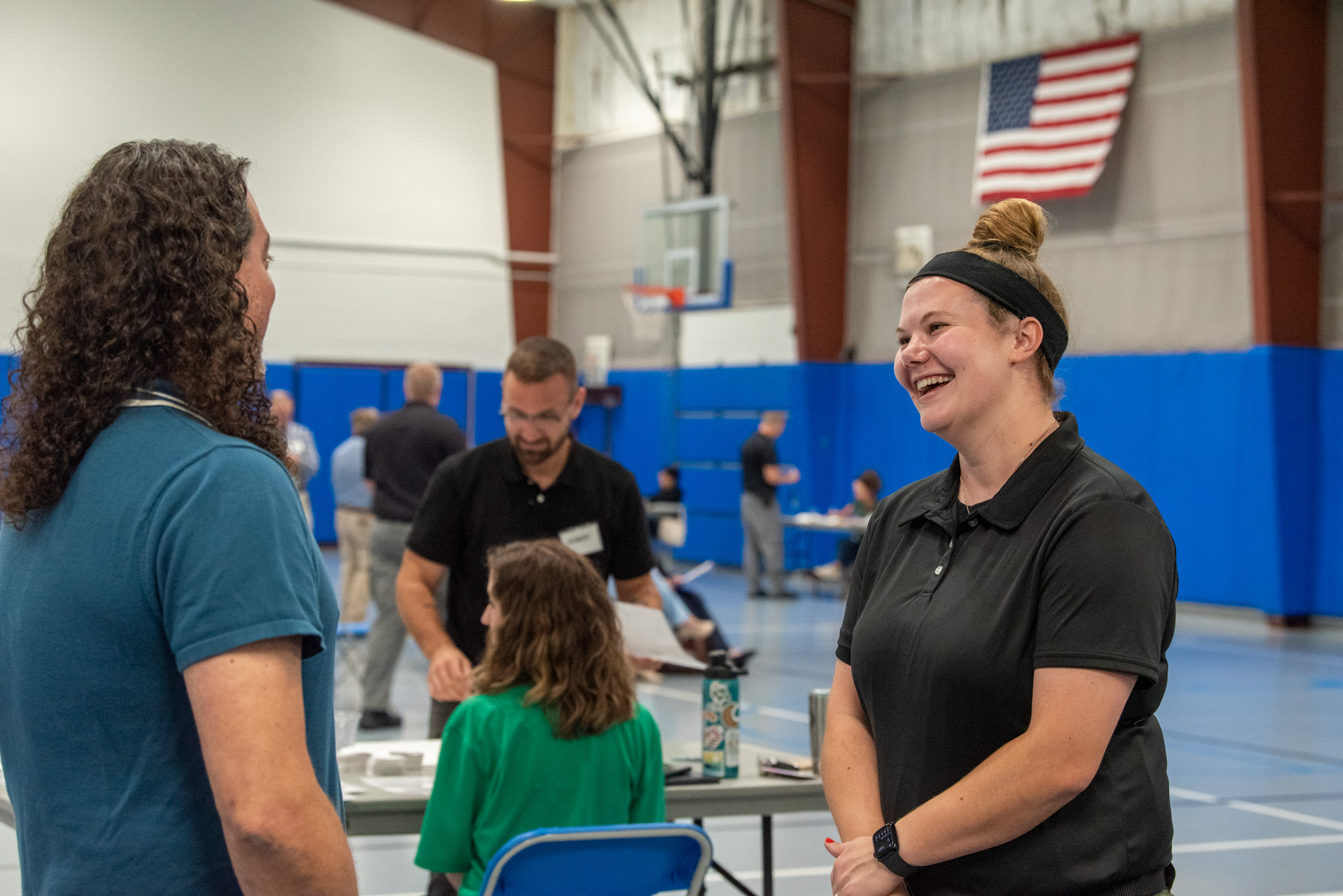 During the debrief, Sines (in green shirt with microphone) and Miller (standing at right), encourage participants to share their experiences.