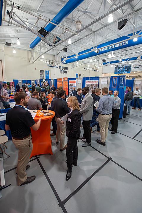 On the first day of the two-day Career Fair at Pennsylvania College of Technology, Bardo Gym, one of two large venues utilized for the event, teems with connectivity.