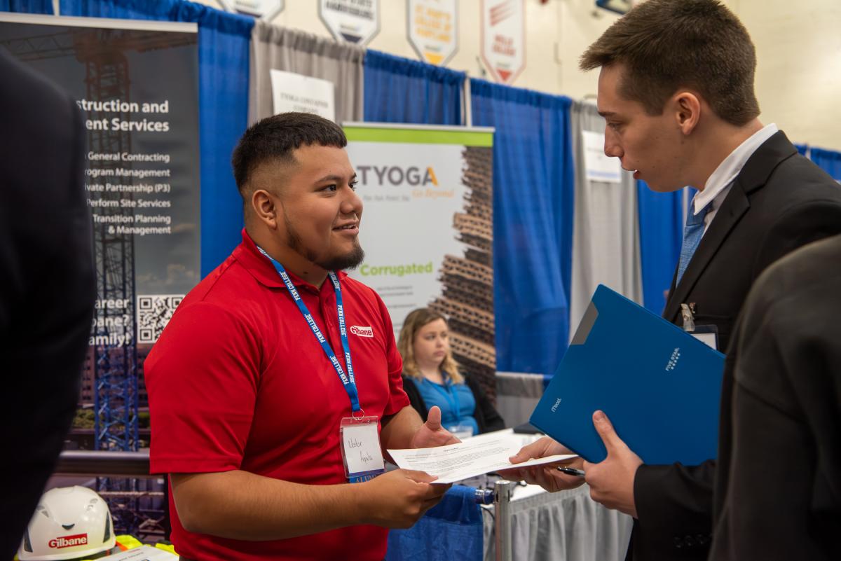 Resume received! Gilbane Building Co.’s Nestor Y. Ayala (left), ’22, construction management, provides a welcoming touchstone for such current construction management students as Chris A. Fisher.