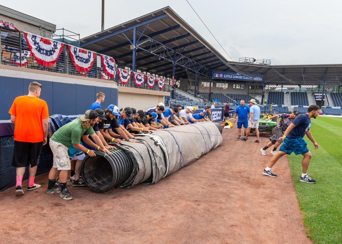 Pennsylvania College of Technology’s Wildcat baseball team members practice their tarp-crew skills before the 2018 MLB Little League Classic, played at Muncy Bank Ballpark at Historic Bowman Field.