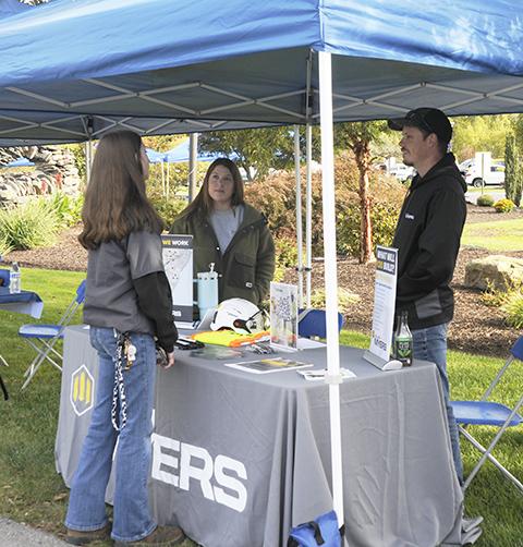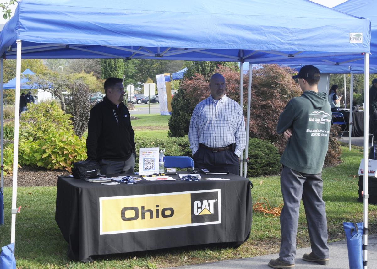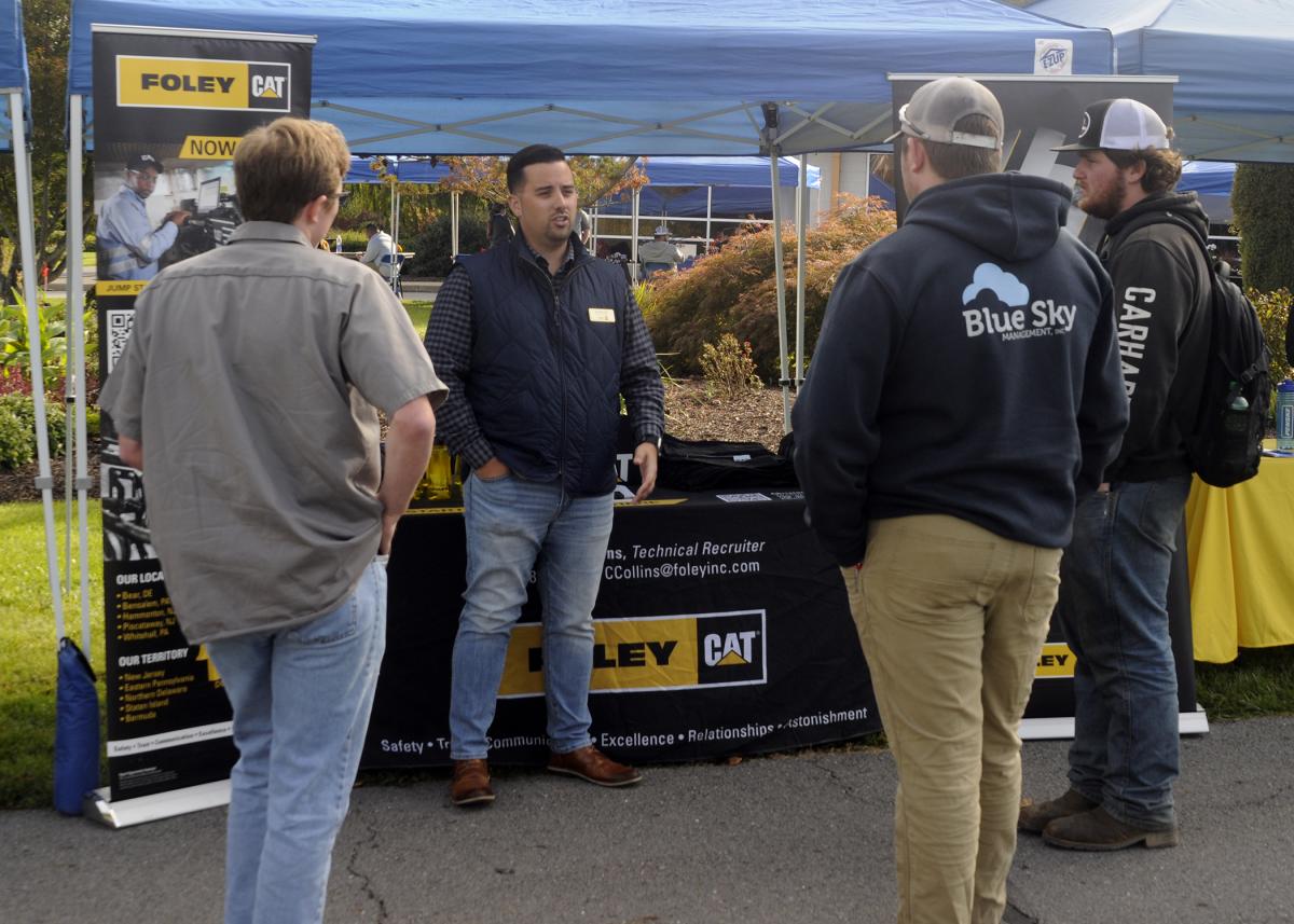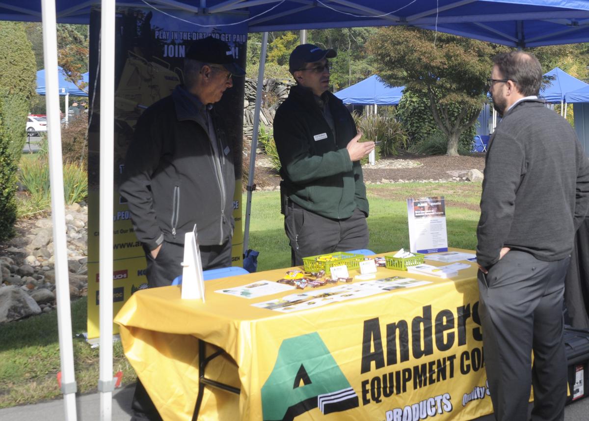 Though partially obscured by the shade of their tent, representatives of Anderson Equipment Co. bring opportunity to light. Talking with Justin W. Beishline, assistant dean of diesel technology and natural resources, are Ed Wallace (left), academic recruiting manager, and Jerry Skiff, director of service. Both were also on hand in March, accompanied by an excavator on loan for student instruction; Skiff additionally is a member of the college's Heavy Construction Equipment Technician Emphasis Advisory Committee.