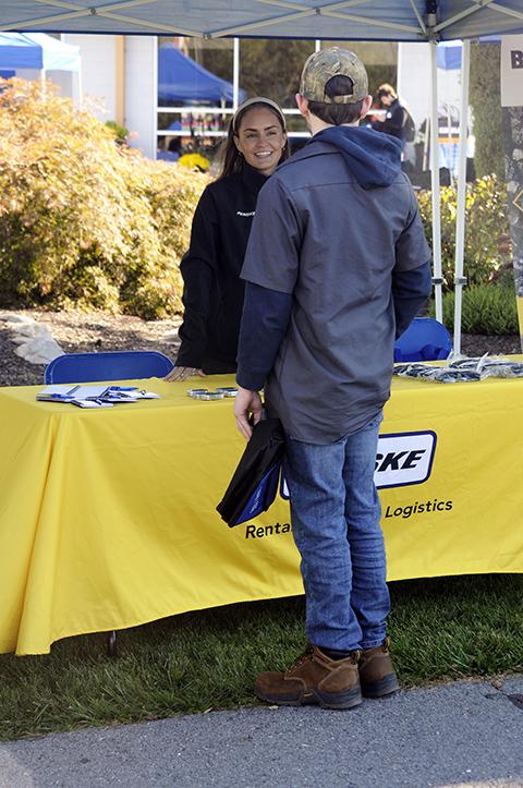 Eddie M. Vaks, of Lansdale, stops by the Penske tent for a chat with recruiter Gwenn Johnson. Vaks is enrolled in heavy construction equipment technology: technician emphasis.