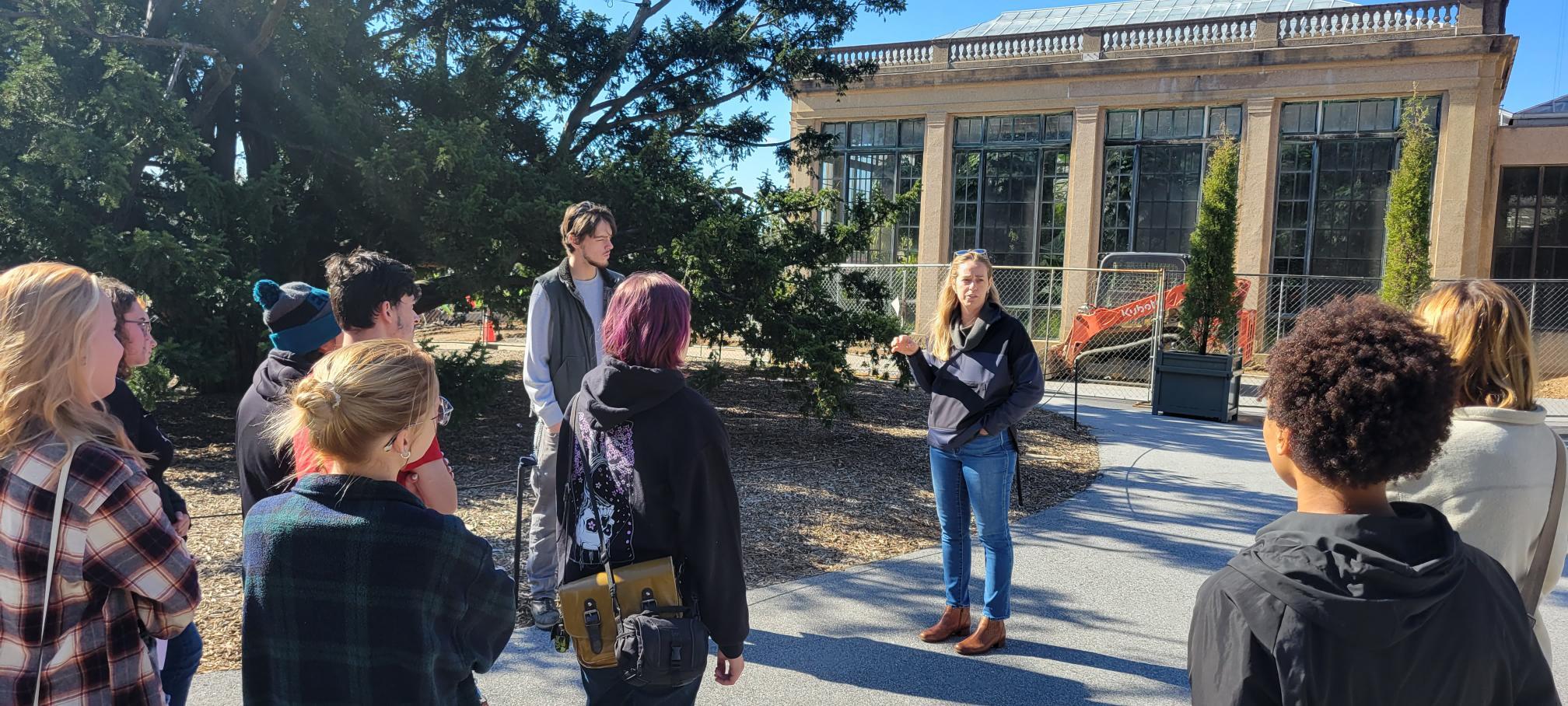 Students talk with Hoderny-Hill during their Longwood Gardens visit.