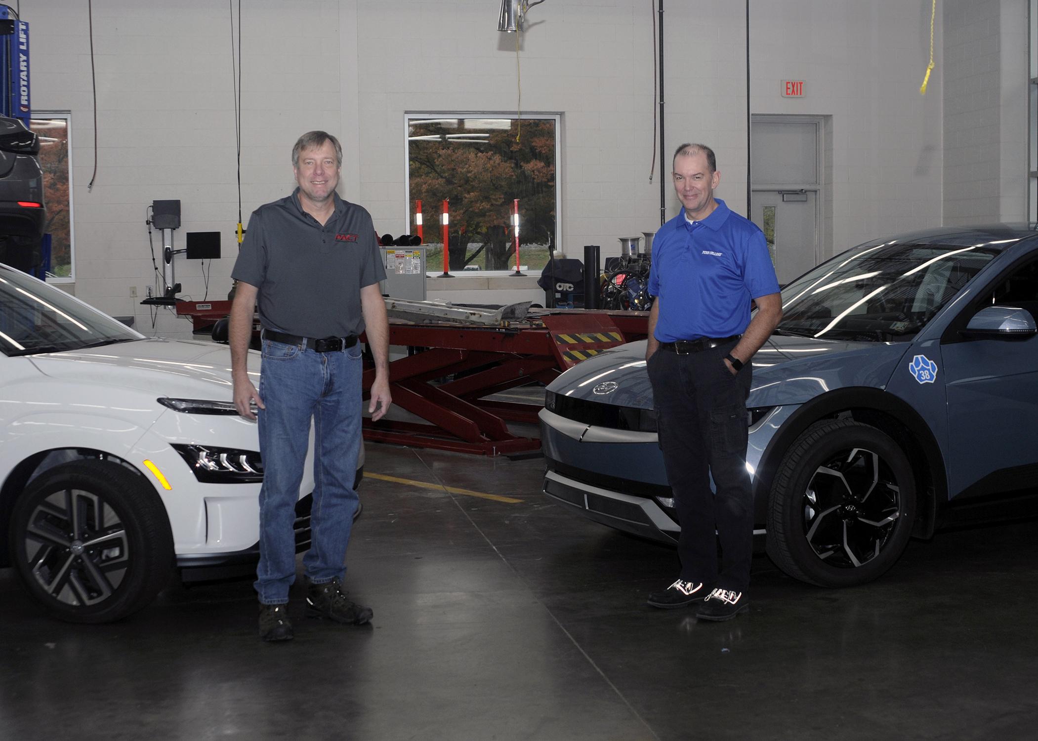 Among faculty members at the forefront of educating tomorrow's electric-vehicle technicians – and standing between two 2023 all-electric vehicles in a Pennsylvania College of Technology lab – are Charles F. Probst (left), the automotive instructor for the college's new three-credit Electric & Hybrid Vehicle Technology course, and Christopher J. Holley, assistant professor of automotive. Each has passed rigorous testing to become two of the first 100 individuals worldwide with EV Pro+ industry certification.