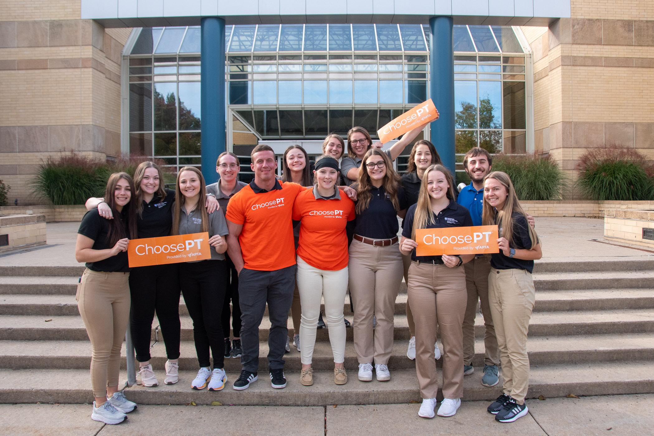 Physical therapist assistant students gather outside the Breuder Advanced Technology & Health Sciences Center to encourage the public to “Choose PT” to help address and avoid movement problems and live a fulfilling, healthy and independent life.