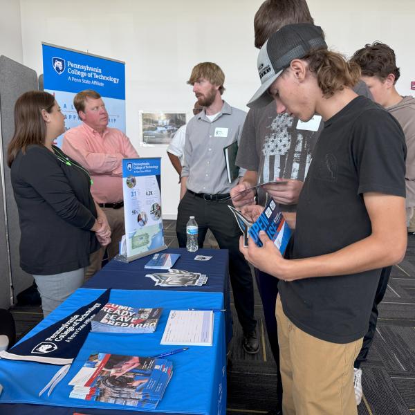 A five-member team from Pennsylvania College of Technology attended, presenting information on campus/program tours, pre-apprenticeships, admissions processes, program options, enrollment and financial aid, and career development. Students then visited the display tables, perusing information and having one-on-one conversations with the Penn College representatives.