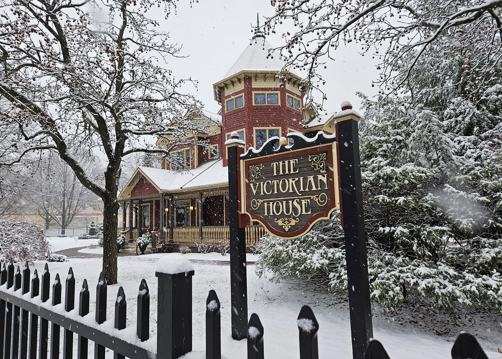 The red wall of The Madigan Library provides a vivid counterpoint to the wintry scene.