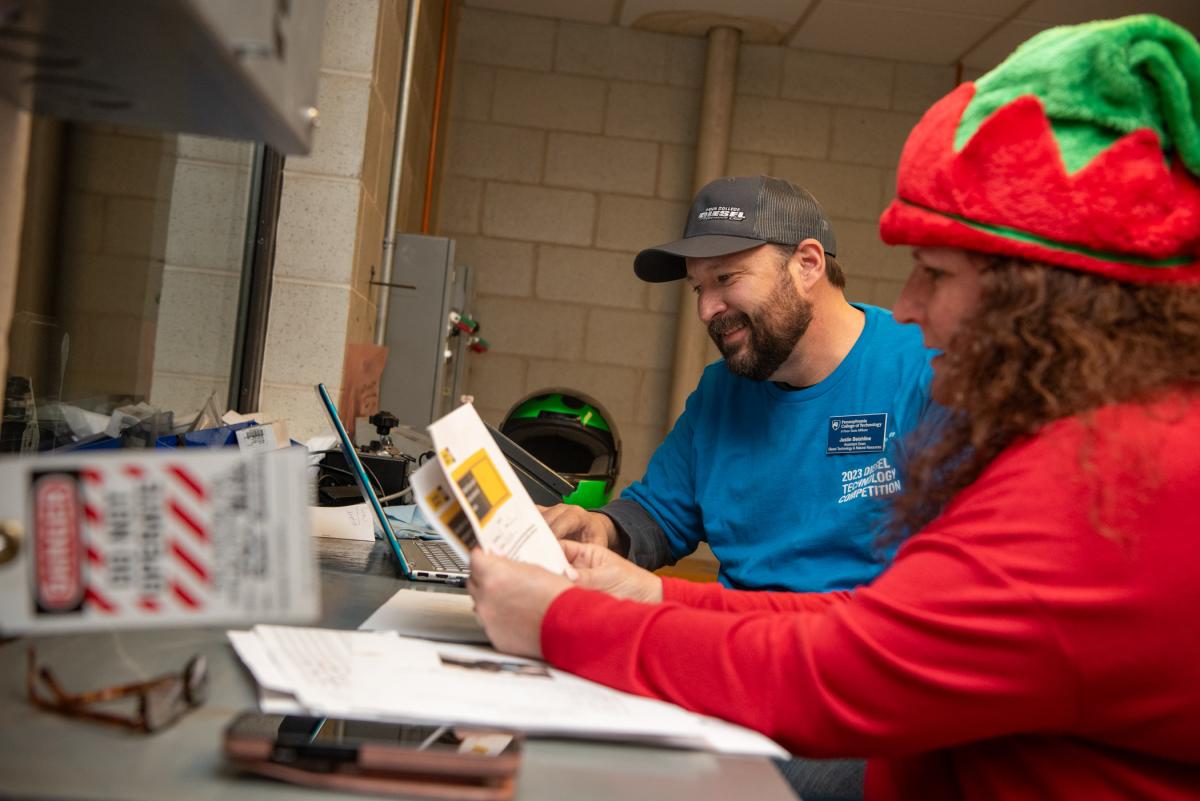 Justin W. Beishline, assistant dean of diesel technology and natural resources, and Marci M. Hessert, his elfin office assistant, are sequestered during the official tally of scores.