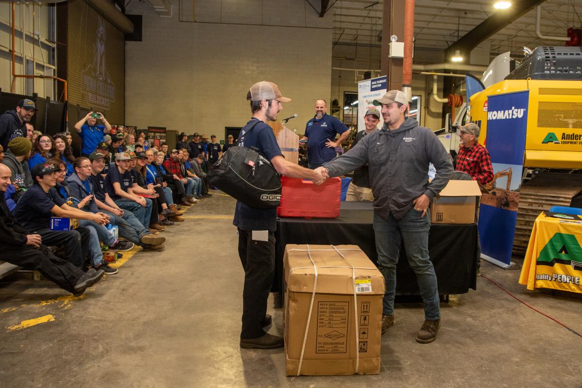 The Service Technicians & Operators' Association donated a 30-inch, five-drawer mechanic’s cart. Club President Jake M. Spinosa, enrolled in heavy construction equipment technology: technician emphasis, gives the winner a congratulatory handshake (and encourages him to come to Penn College where he’ll have a ready-made group of friends with home to hang out).