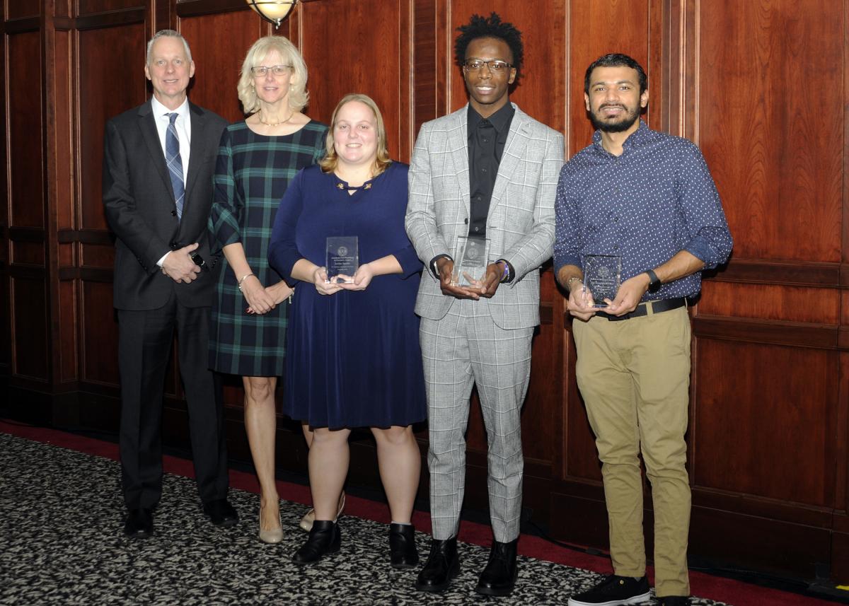 Collegewide honors were presented to three graduating Pennsylvania College of Technology students during an Excellence in Student Leadership and Service Awards Ceremony, held just prior to the Fall 2023 Commencement at the Community Arts Center in Williamsport. From left are Penn College President Michael J. Reed; Joanna K. Flynn, vice president for academic affairs and provost; Jordan Specht, who received the Academic Vice President and Provost's Award; Samir K. Pringle, recipient of the President’s Award (and the day’s student commencement speaker); and Jay K. Patel, who received the Board of Directors’ Award.