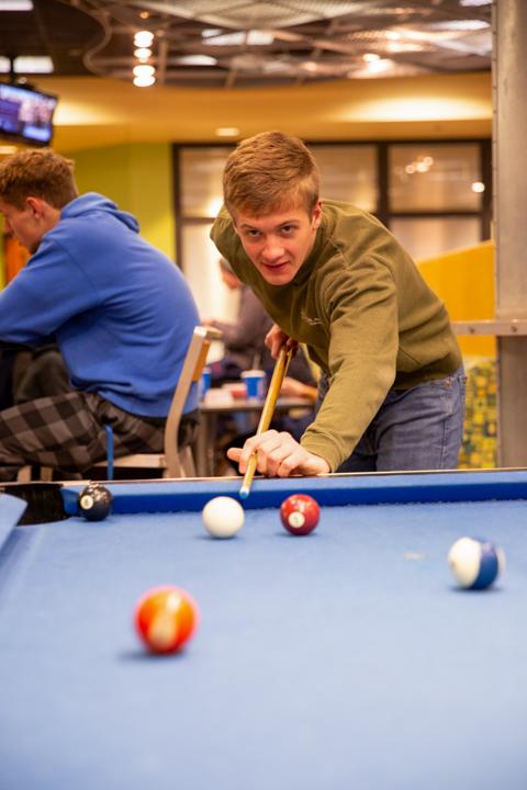 Adeptly juggling bingo chip and billiards stick is Brice L. Hall, aviation maintenance technology.