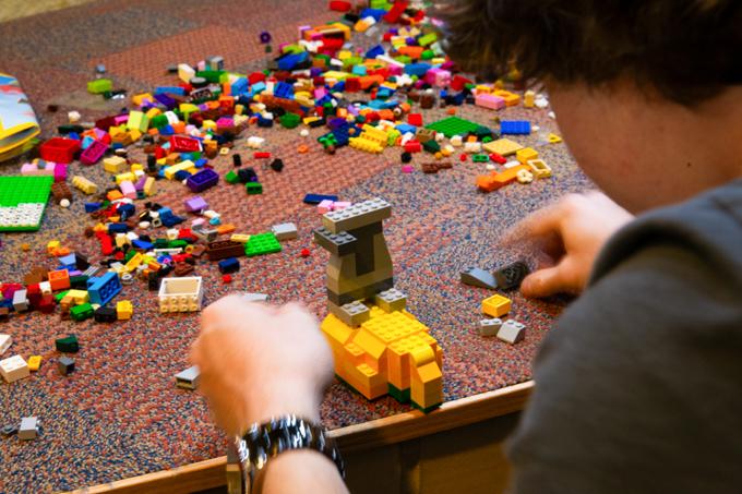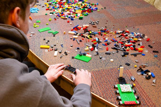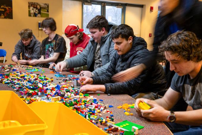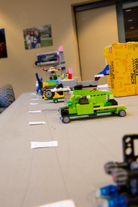 Revving their creative engines, students start their Lego vehicles in the Bush Campus Center TV Lounge.