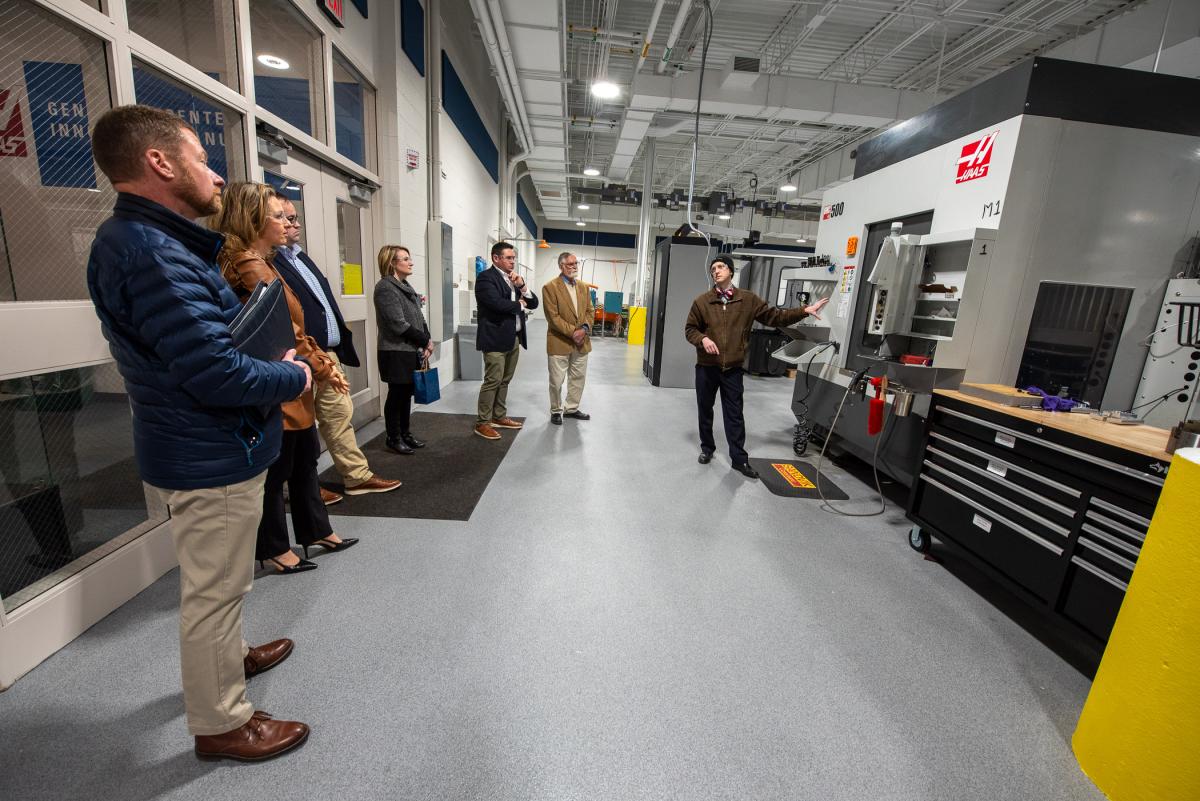 Webb (at right) and Kline (fourth from left) offer highlights in the Gene Haas Center for Innovative Manufacturing.
