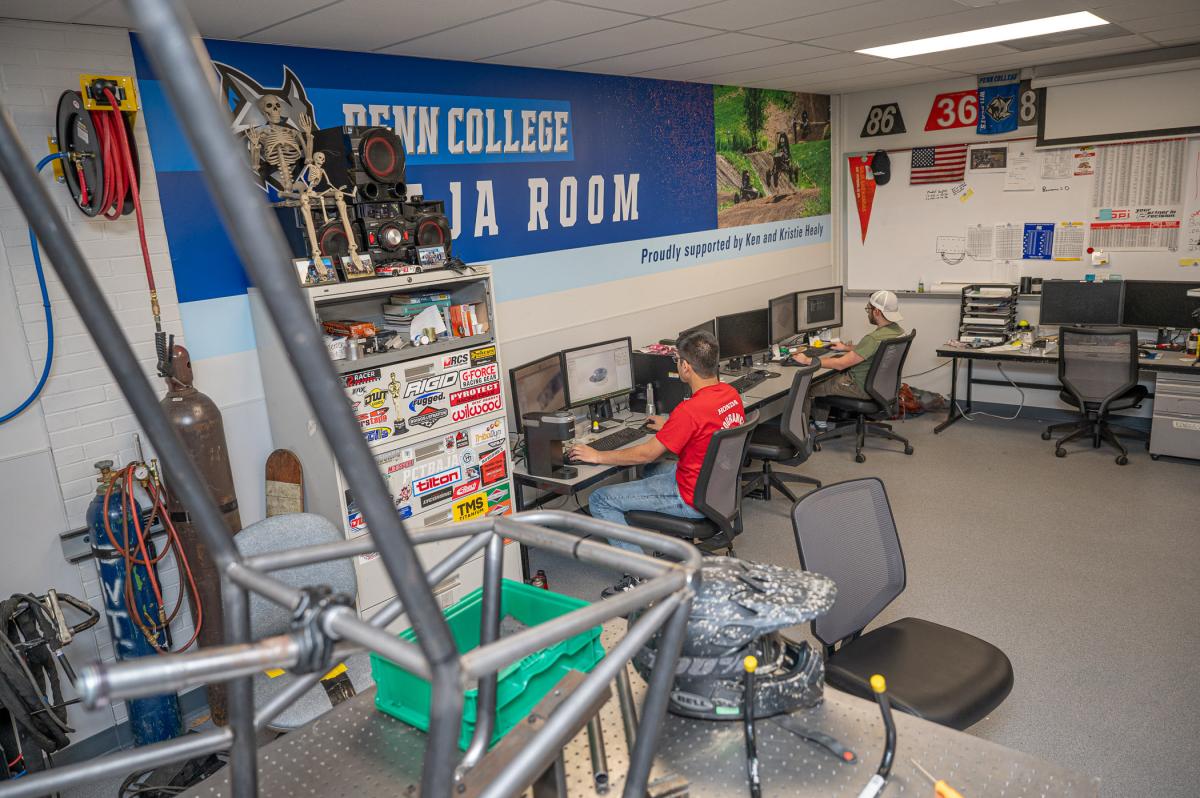 The chassis for the college’s car is taking shape in the Penn College Baja Room.