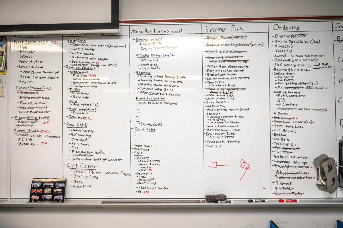 The to-do list is an extensive one for the Baja team! The students make about 90% of the car’s parts.