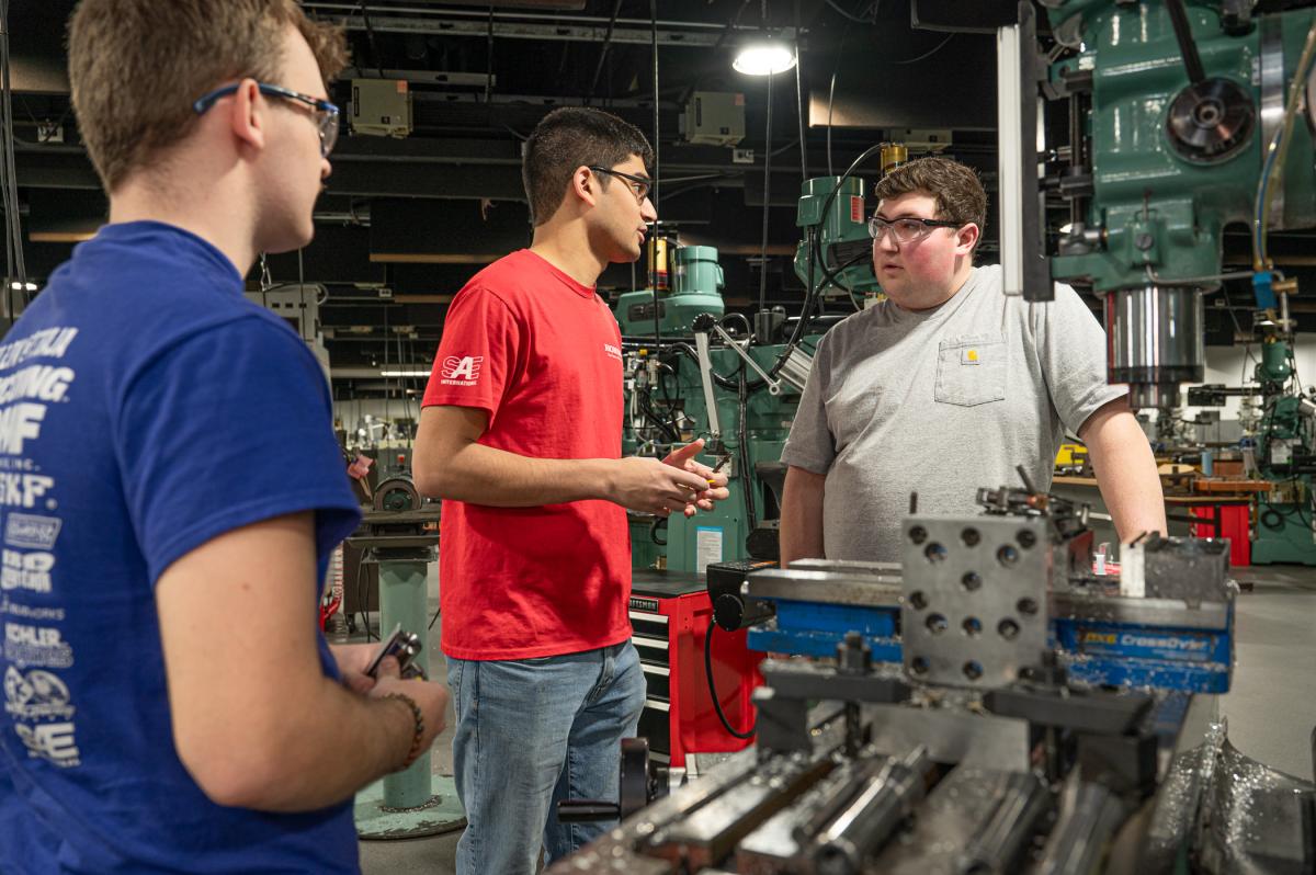 From left to right, Benninger, Meda and Cooke discuss machining strategy.