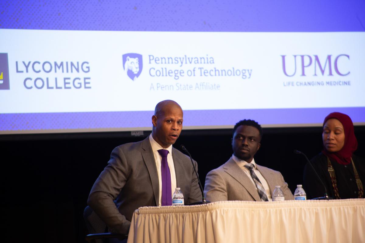 Allen Taylor, math teacher and head boys basketball coach at Williamsport Area High School, shares his thoughts as part of the Night of Empowerment panel discussion. Other panelists (from left) are: Lt. William C. Slaton, staff services section commander for the Pennsylvania State Police; Mohamed Osman, pain medicine physician at UPMC; Emma Thompson, administrative officer at the Lycoming-Clinton Joinder Board; and Dawn M. Dickey, director of disability and access resources at Penn College.