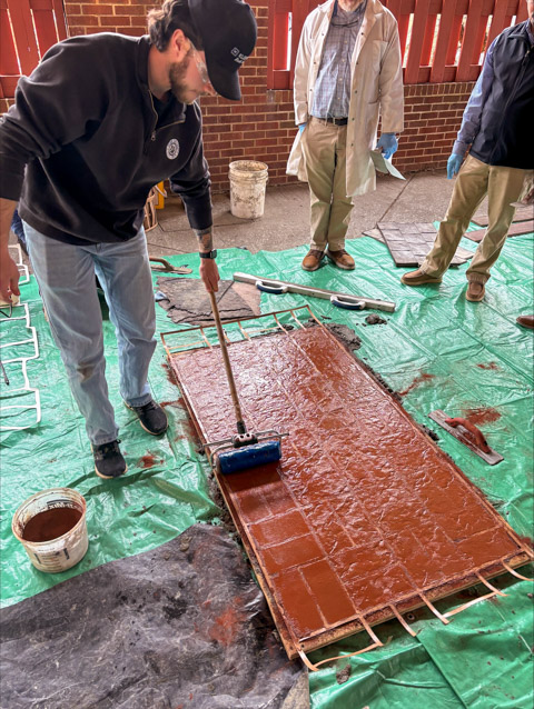 Joe F. DiBucci, instructor of building construction technology: concrete and masonry for Pennsylvania College of Technology, demonstrates for K-12 teachers how to color concrete that has been stenciled to look like brick. The Penn College faculty provided instructions for the FFA teachers to repeat the activity with their students.