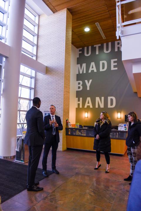 In the lobby of the Davie Jane Gilmour Center, Mumin is engaged by Reed in Penn College's "future made by hand." To the right are Smith and Lena (far right).