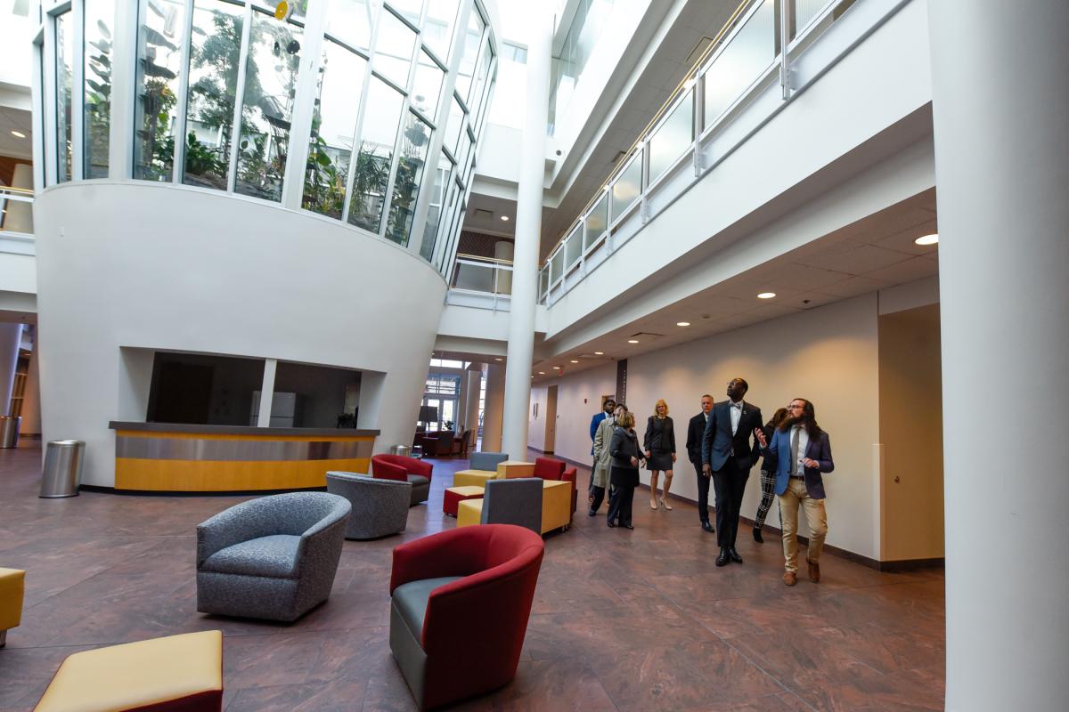 The group begins its tour in the impressive Gilmour Center, home to numerous student services. Offering Mumin an overview is Pace (at far right).