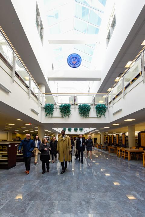Greeting the educational leader in the Davie Jane Gilmour Center were President Michael J. Reed; Joanna K. Flynn, vice president for academic affairs and provost; Loni N. Kline, senior vice president for college relations; Anthony J. Pace, associate vice president for enrollment & academic operations; Bradley M. Webb, dean of engineering technologies; Nate Woods Jr., special assistant to the president for inclusion transformation; and Patrick Marty, chief government & international relations officer.
