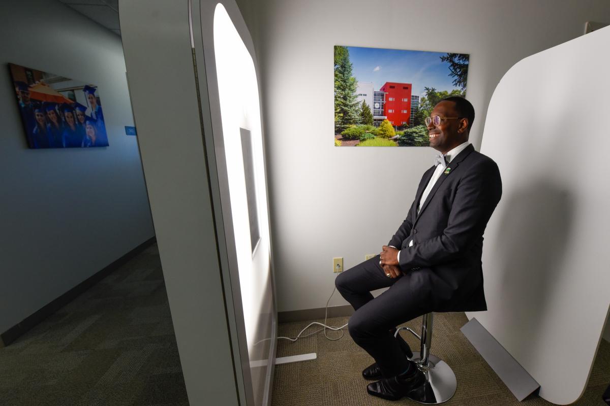 In the Center for Career Design, Mumin joyfully utilizes the photo booth for professional portraits ...
