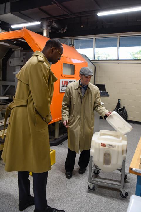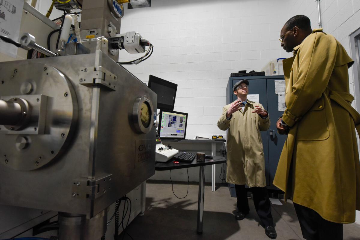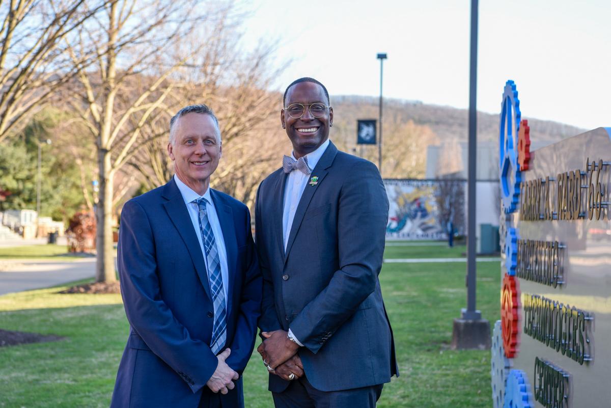 Penn College President Michael J. Reed (left) joins State Education Secretary Khalid N. Mumin on a tour of campus Thursday.