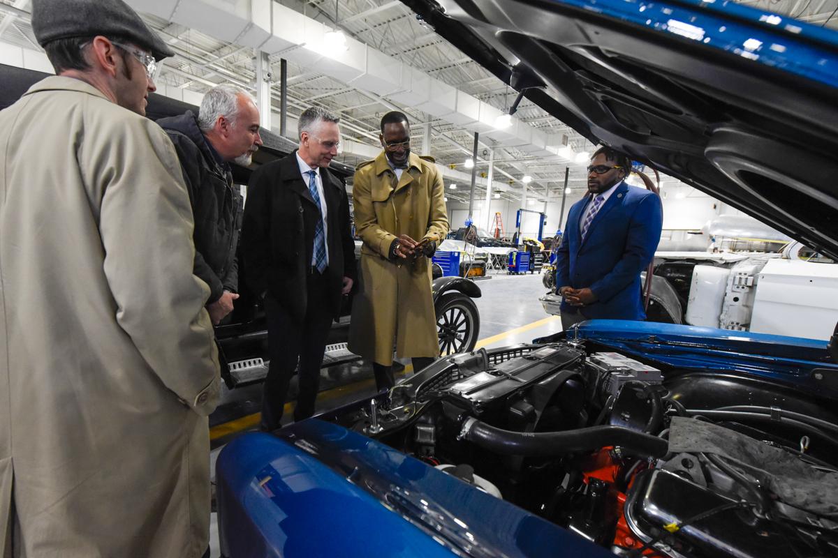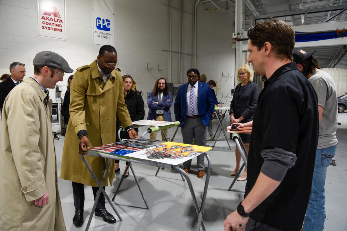 In the collision repair lab, Mumin and Woods (at center in blue blazer) engage with students in the popular Auto Graphics class ...