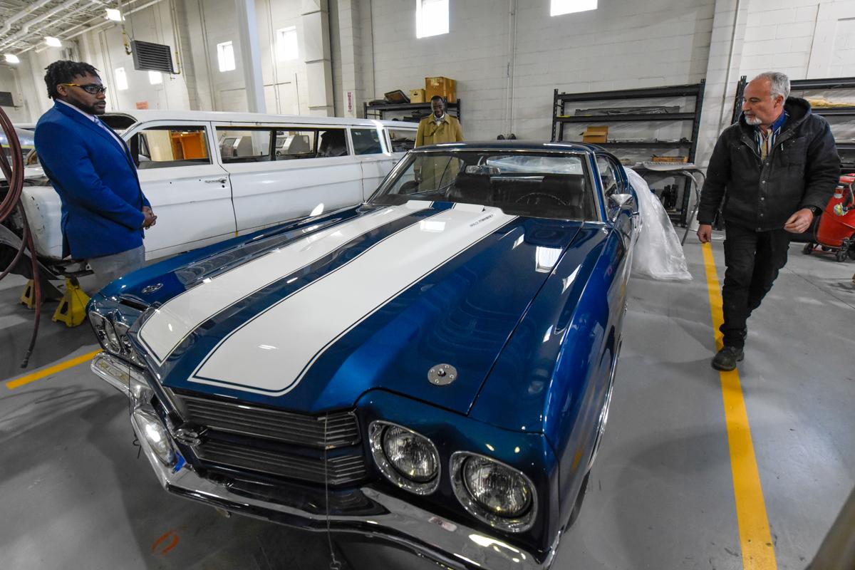 With the assistance of collision repair instructor Roy H. Klinger (at right), Mumin (near back of car) removes a plastic cover, revealing the brilliance of a 1970 Chevrolet Chevelle Super Sport, an award-winning restoration project completed by Penn College students.