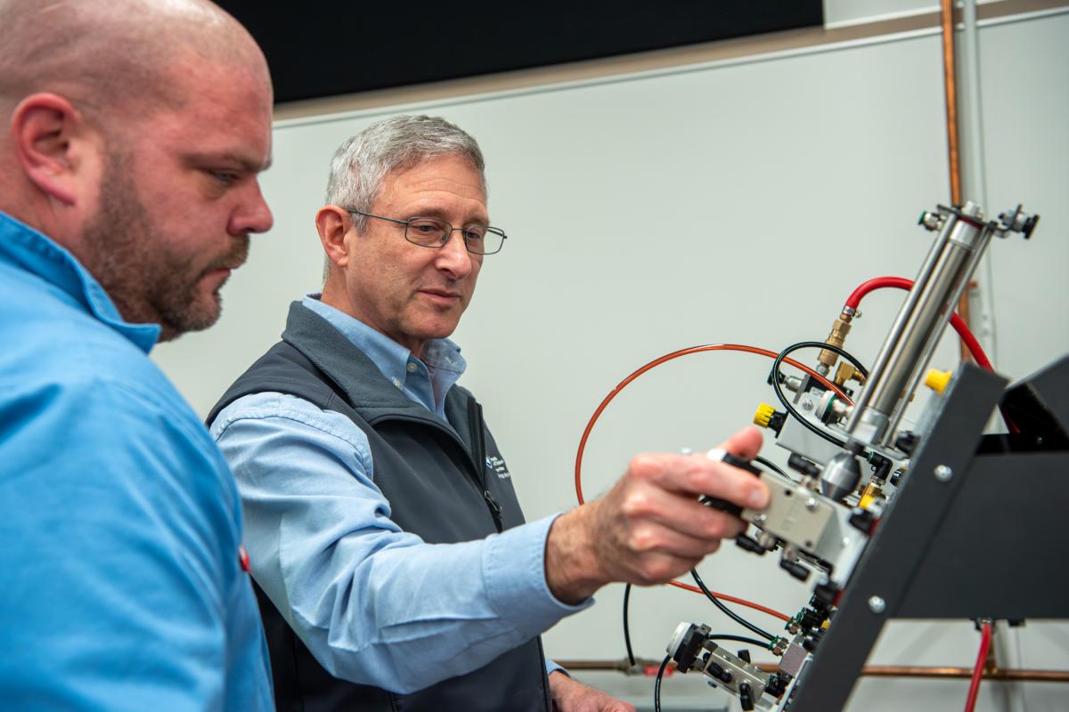 Thomas W. Fry (right), industrial training specialist with Workforce Development at Pennsylvania College of Technology, works with Jeff Steinbacher, a Kellanova employee who is enrolled in a mechatronics apprenticeship program.
