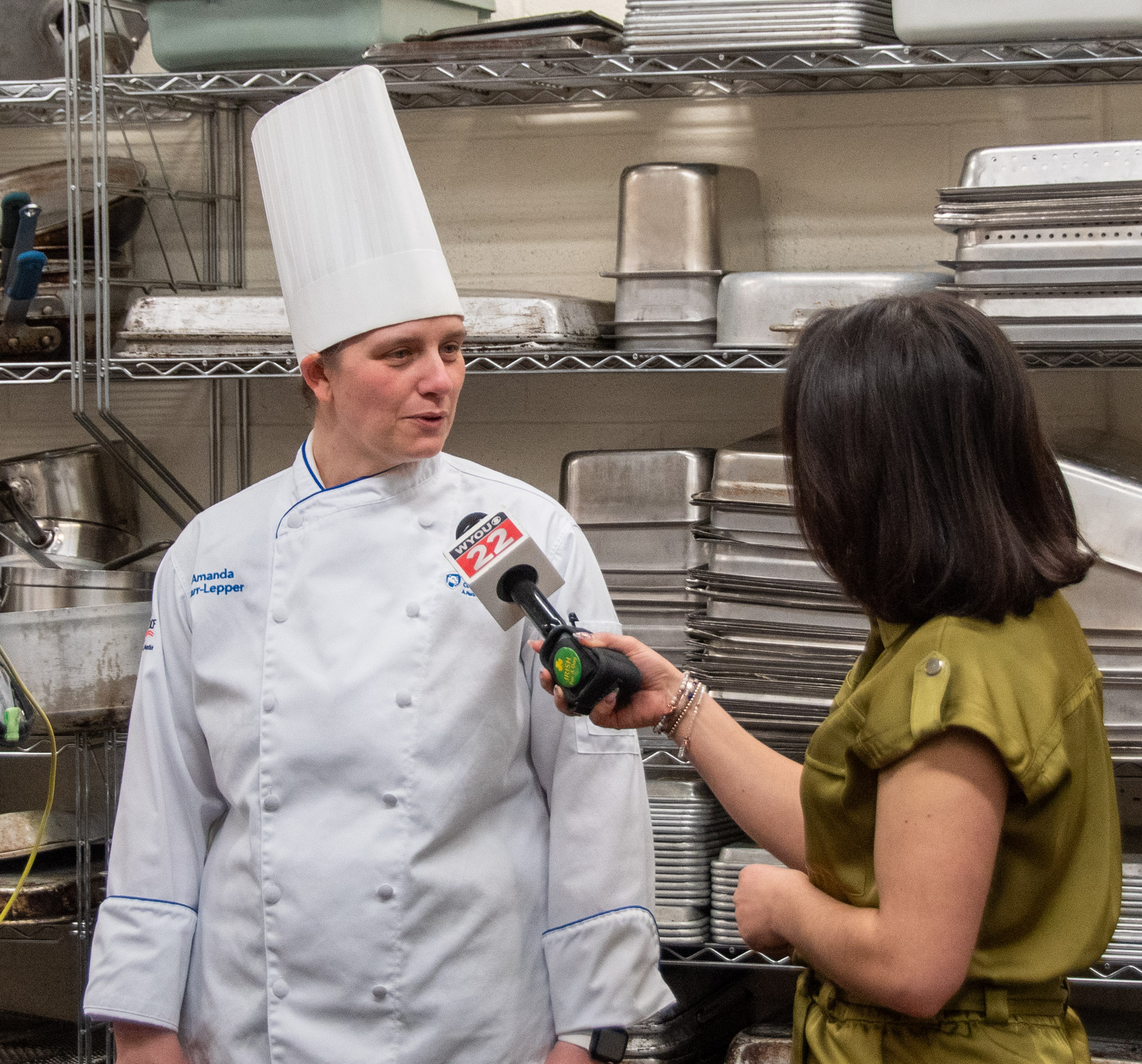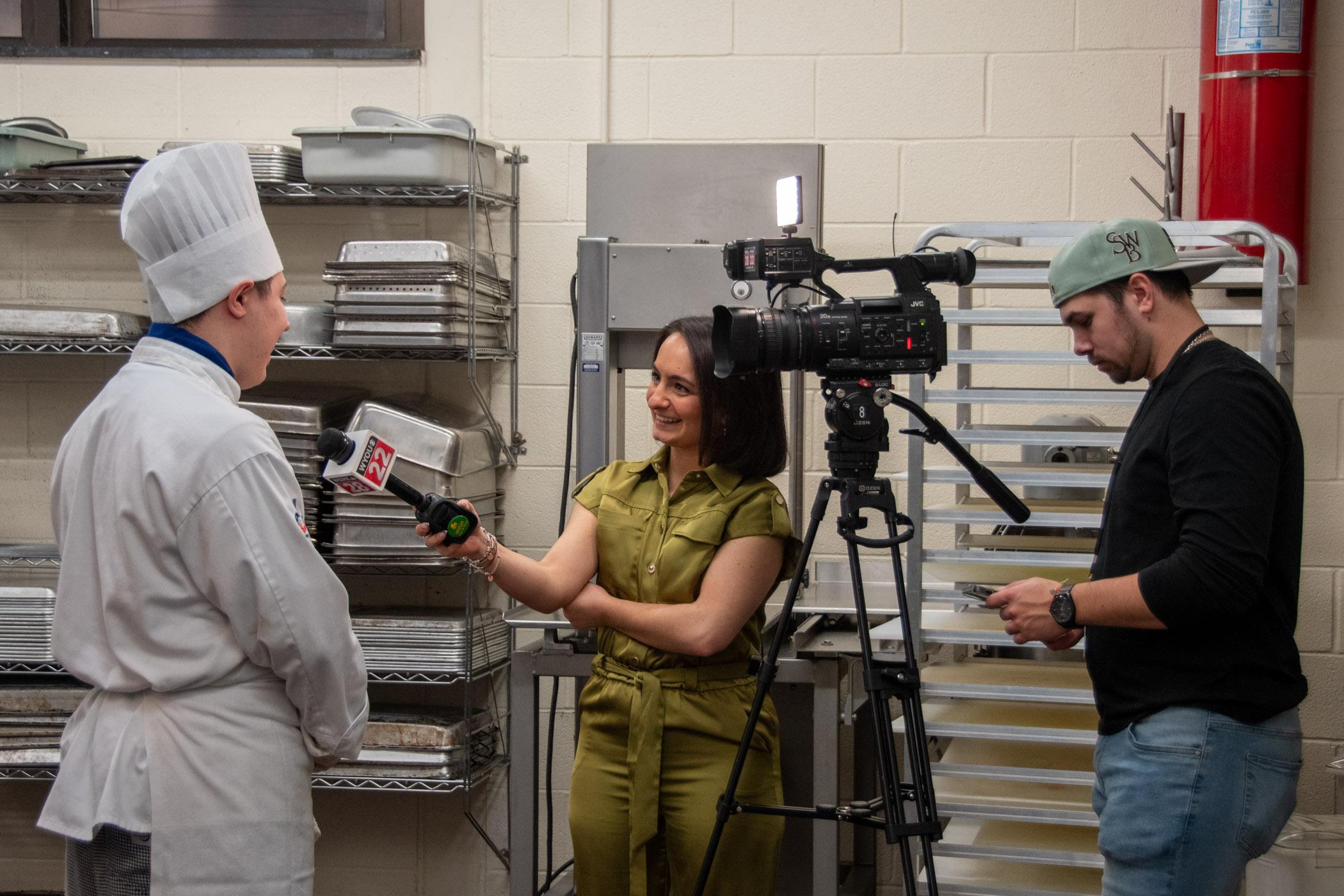 WBRE’s “Eyewitness News” team visited Penn College’s culinary arts labs early Wednesday to broadcast live as students prepared for this evening’s Napa Valley dinner in Le Jeune Chef Restaurant. The restaurant, open to the public, is a live-learning lab for students. Additional pieces recorded in the kitchens are set to air on today’s 11 a.m., noon and 5:30 p.m. newscasts.