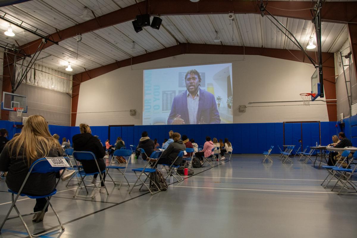 Nate Woods Jr., special assistant to the president for inclusion transformation, offers a prerecorded message to help participants to consider: “Why are people living in situations like you just experienced?”