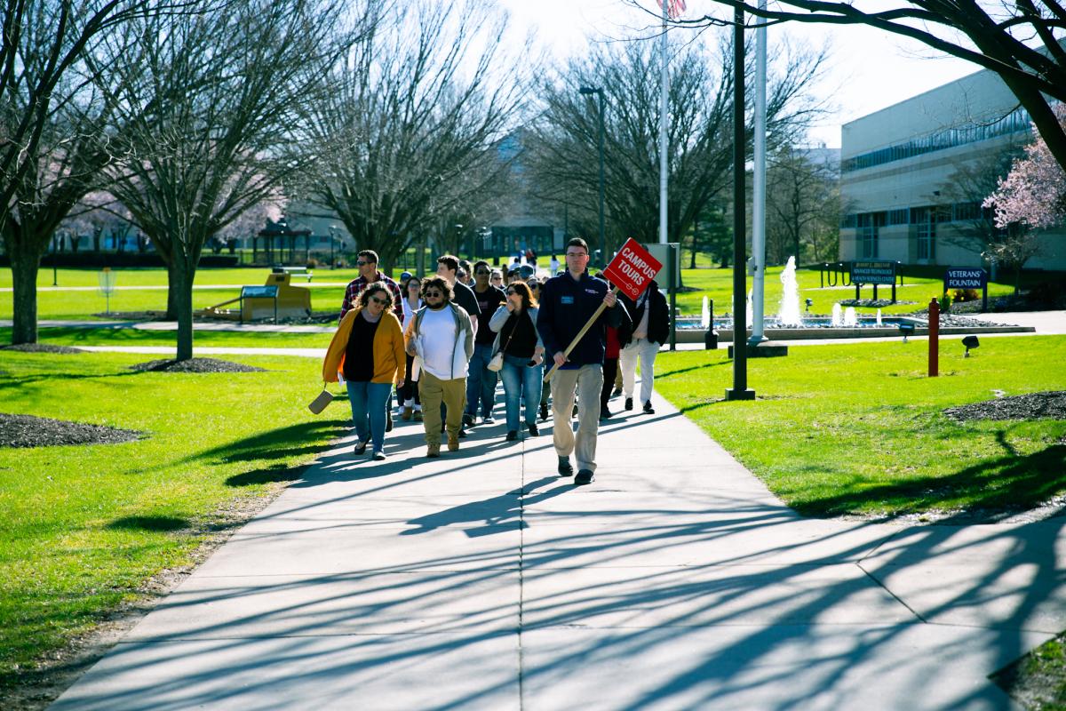 Presidential Student Ambassador Caleb J. Albaugh, an automotive technology student from Montoursville, leads a group down the campus mall on Sunday for the second Open House of the Spring 2024 semester.