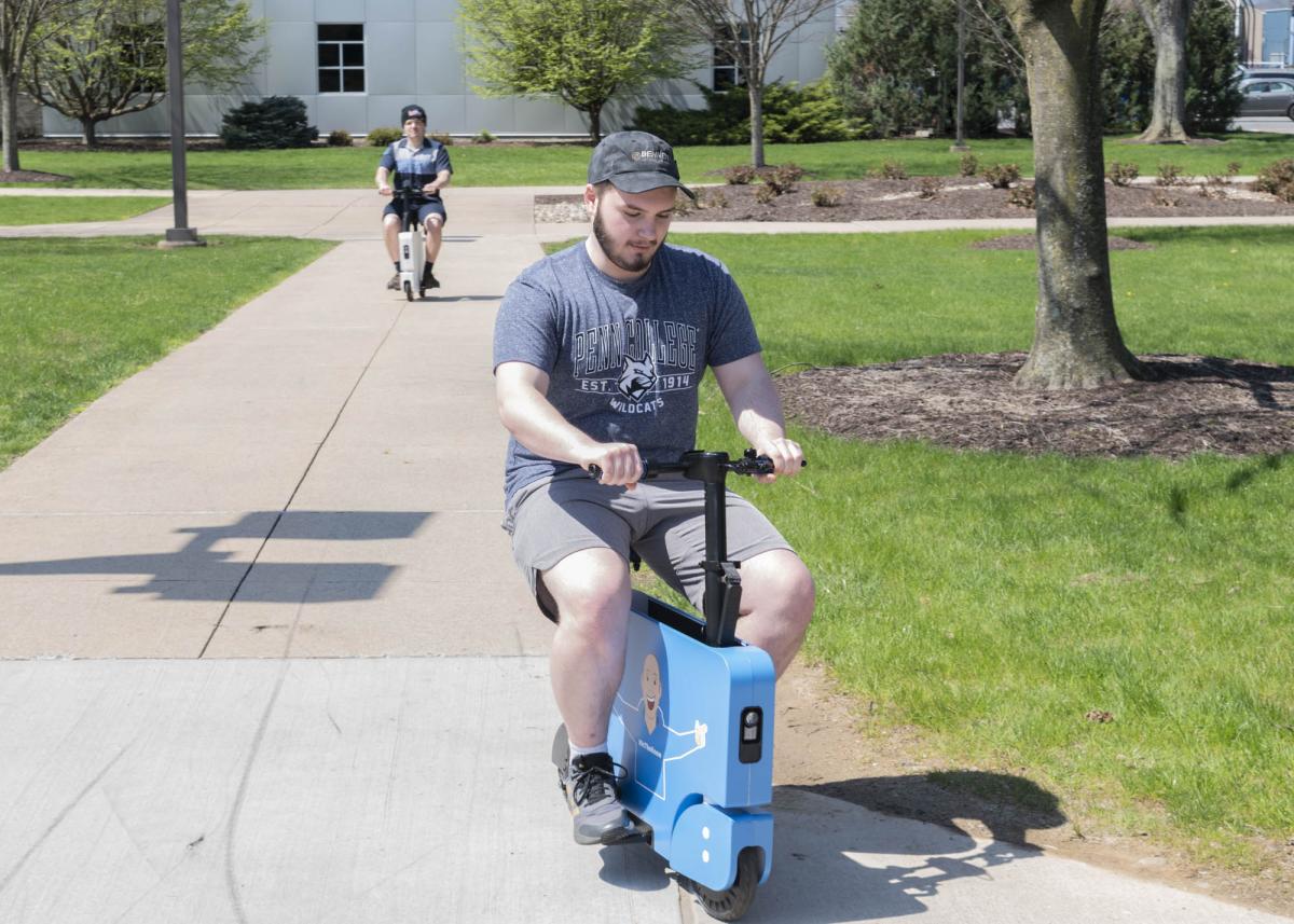 Scooting around campus: Evan J. Lanzendorfer (foreground), of North Cambria, and Elijah Hennon, of New Cumberland. They are enrolled in automotive technology: Honda PACT emphasis.