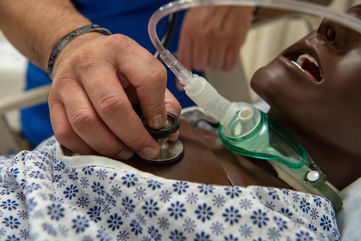 A Pennsylvania College of Technology student checks heart and lung sounds on a simulation manikin. More than 95% of Penn College associate-degree and bachelor’s degree nursing graduates passed the National Council Licensure Exam for Registered Nurses on their first attempt in 2022-23, well above the state and national first-attempt pass rates.