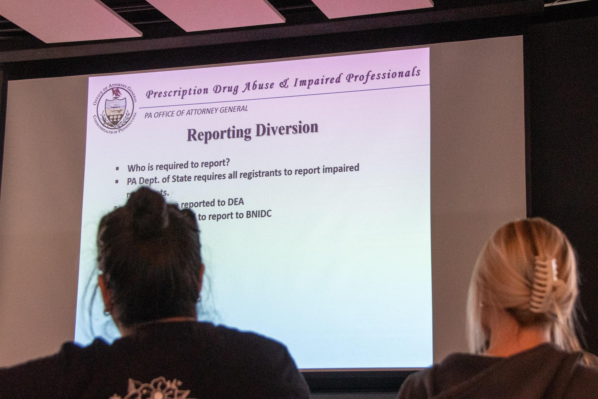 An audience of nurses, nursing students and other health care professionals hears a presentation by Special Agent Alan McGill on drug diversion in health care, including reporting procedures and several examples of why and how health care workers have diverted prescription drugs. The event was sponsored by the Penn College chapter of Sigma Theta Tau international honor society for nurses.