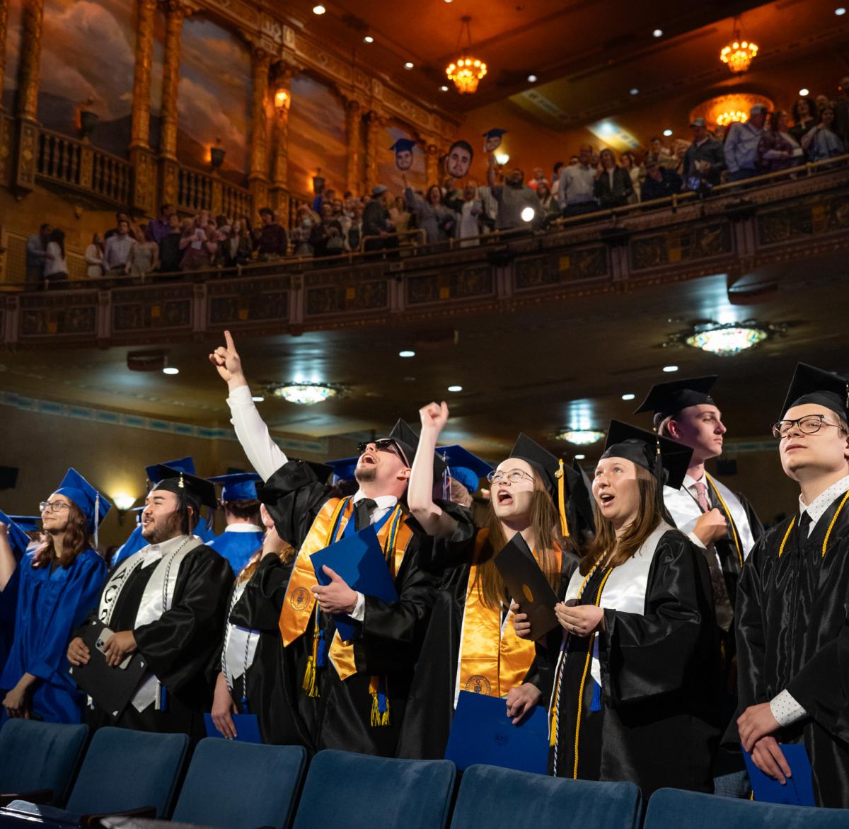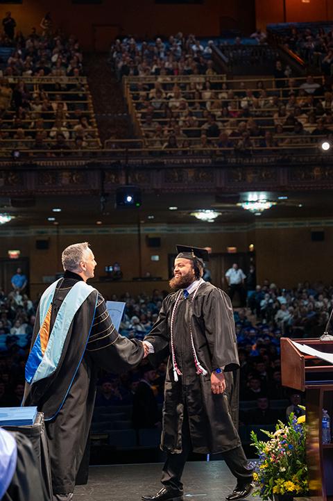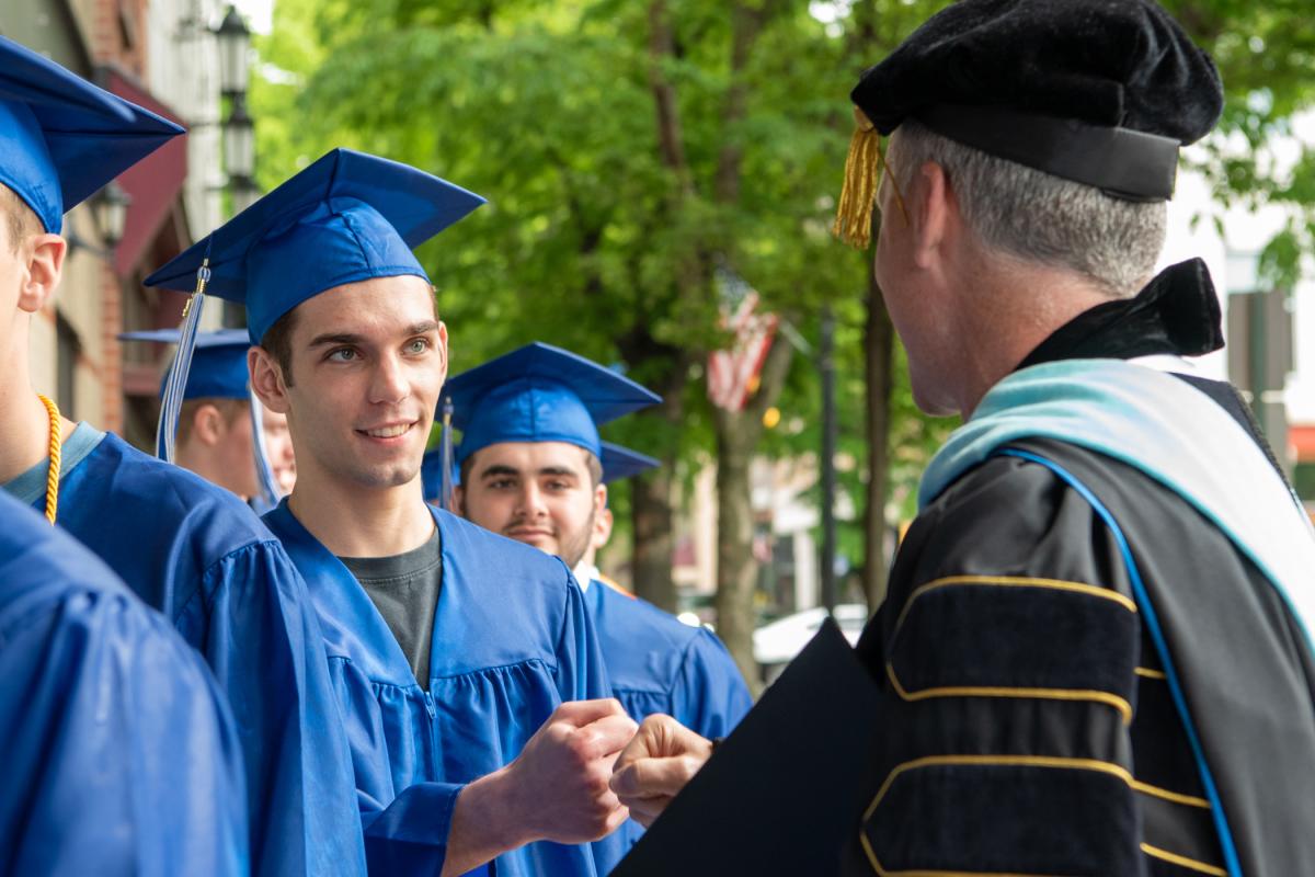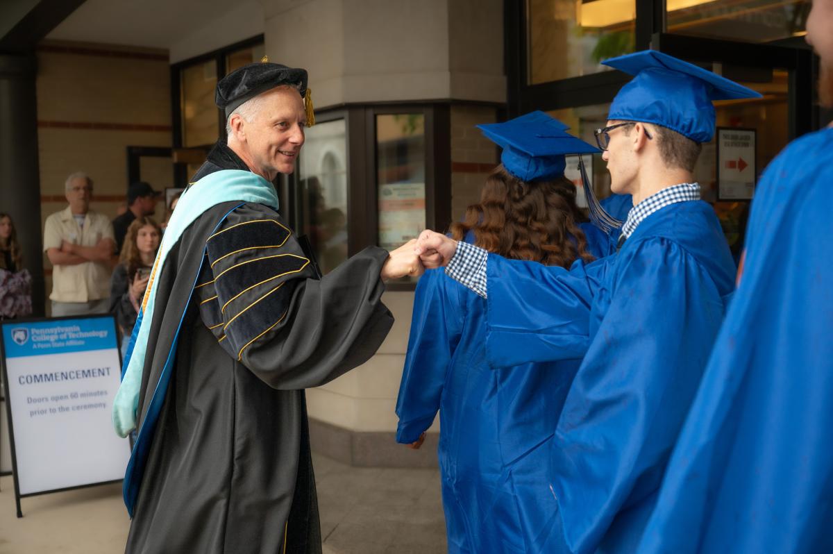 As graduates make their way into the CAC, they are greeted at the door by a presidential fist-bump, courtesy of Michael J. Reed.