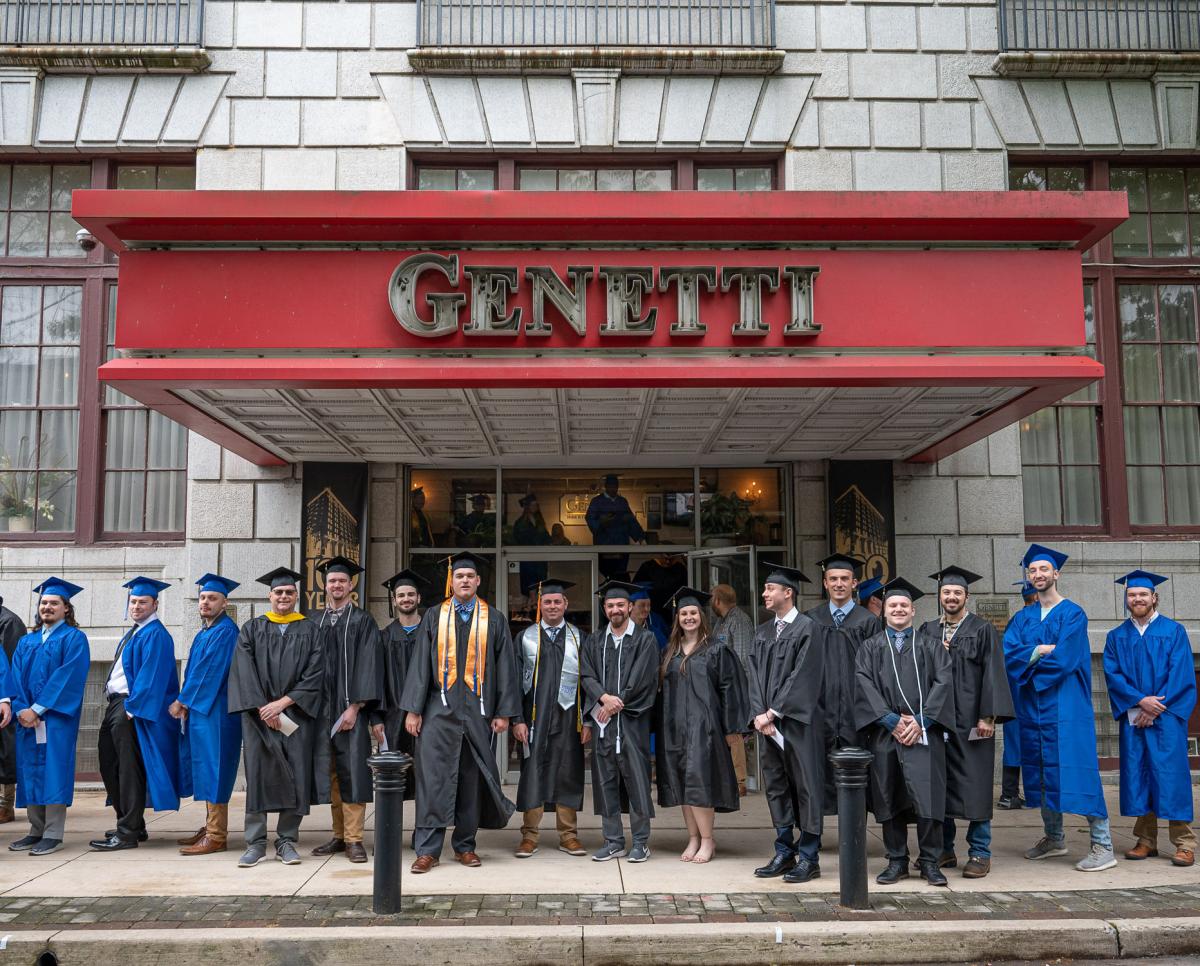 The Saturday morning crew is ready to process! The Genetti Hotel, around the corner from the Community Arts Center, serves as graduates' starting point on commencement days.