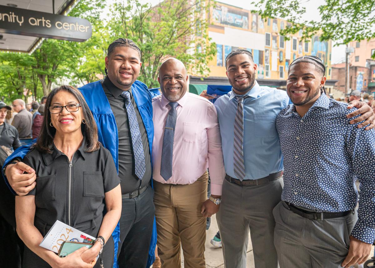 The president playfully "photo bombs" a multi-generational family photo with dental hygiene graduate Wangden Tenzin Nangpa.