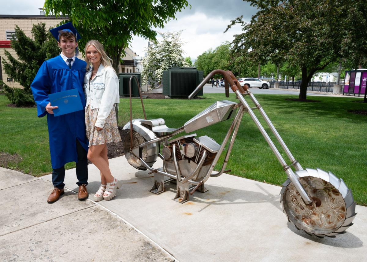 Back on campus, welding technology grad Corbin James Coulson and friend find a sliver of sunshine at the popular photo spot – the motorcyle crafted by welding students.