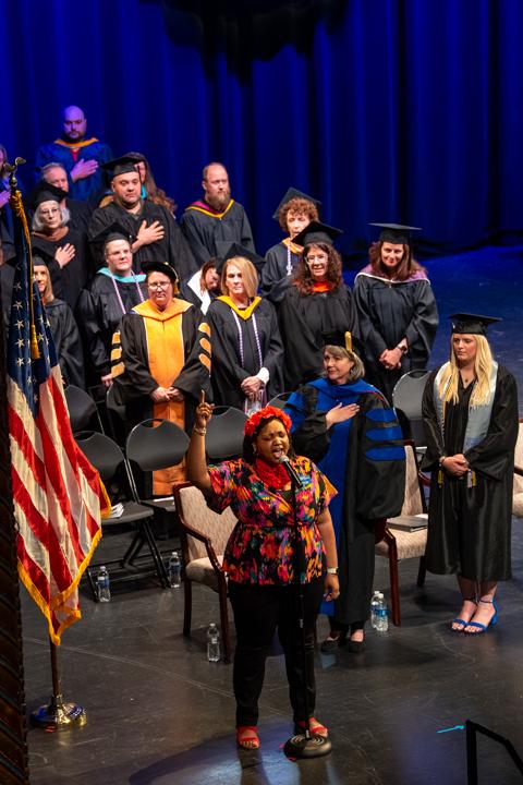 Hitting a high note as she delivers a gorgeous rendition of the National Anthem: Tamaka F. Carter, financial aid support specialist and business administration student, who shared her musical gifts for each of the three weekend ceremonies