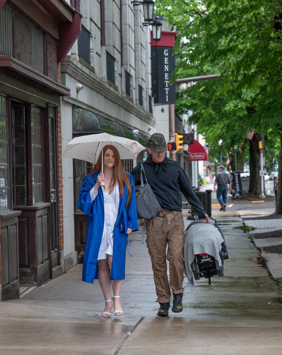 Even in the midst of Friday's downpours, graduates and their family members line up at the college entrance to capture memories. Dental hygiene graduate Meghan E. Miller is on the left.