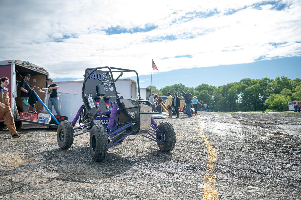 Day one of Baja SAE Williamsport kicked off on Thursday with ideal spring weather and high spirits, as the 100+ teams made their way from Penn College's main campus in Williamsport to the competition venue at the college's Heavy Construction Equipment Training Operations in Brady Township. There, teams registered, settled into their paddocks, socialized with fellow competitors, and took their cars through SAE's tech inspection and engine check stations. Teams also connected with event sponsors, ate lunch and enjoyed the beautiful, green central Pennsylvania scenery.