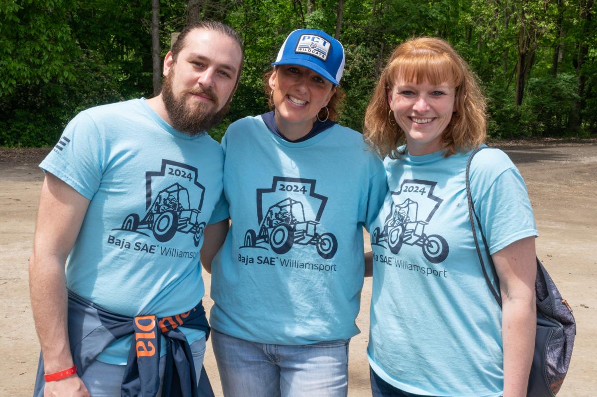 At the competition site, Penn College employees, friends and sponsors are all smiles. From left: Anthony J. Pace, associate vice president for enrollment and academic operations; Kimberly R. Cassel, director of college relations; and Kristie Healy, Penn College Baja Room sponsor.