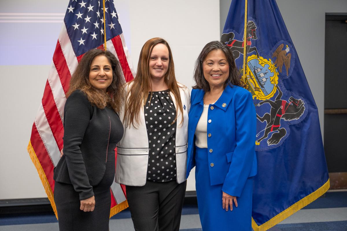 Also joining Su for a photo are representatives of the U.S. Department of Labor, Employment and Training Administration, (on left): Jovon Hill and Kerri Gatling, from DOL Region 2 – Philadelphia; and R. Kenyon Corbett (on right), program analyst with DOL’s Office of Apprenticeship.