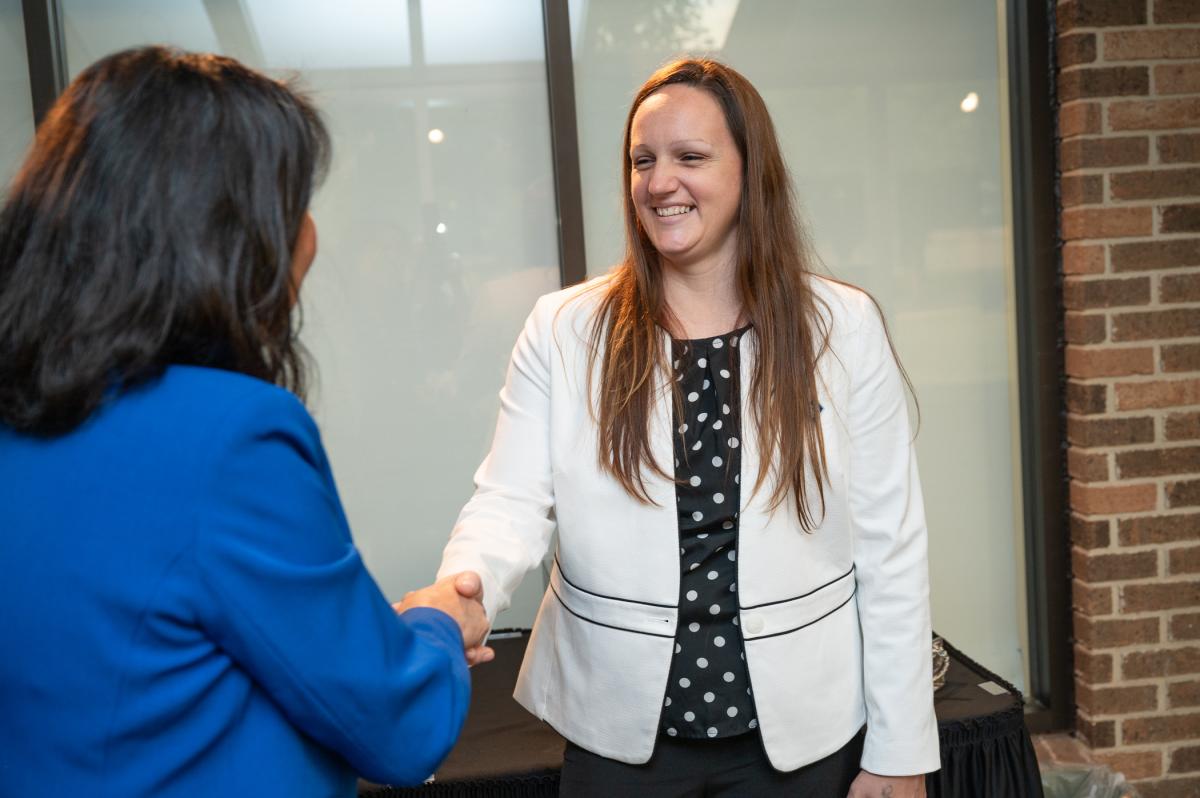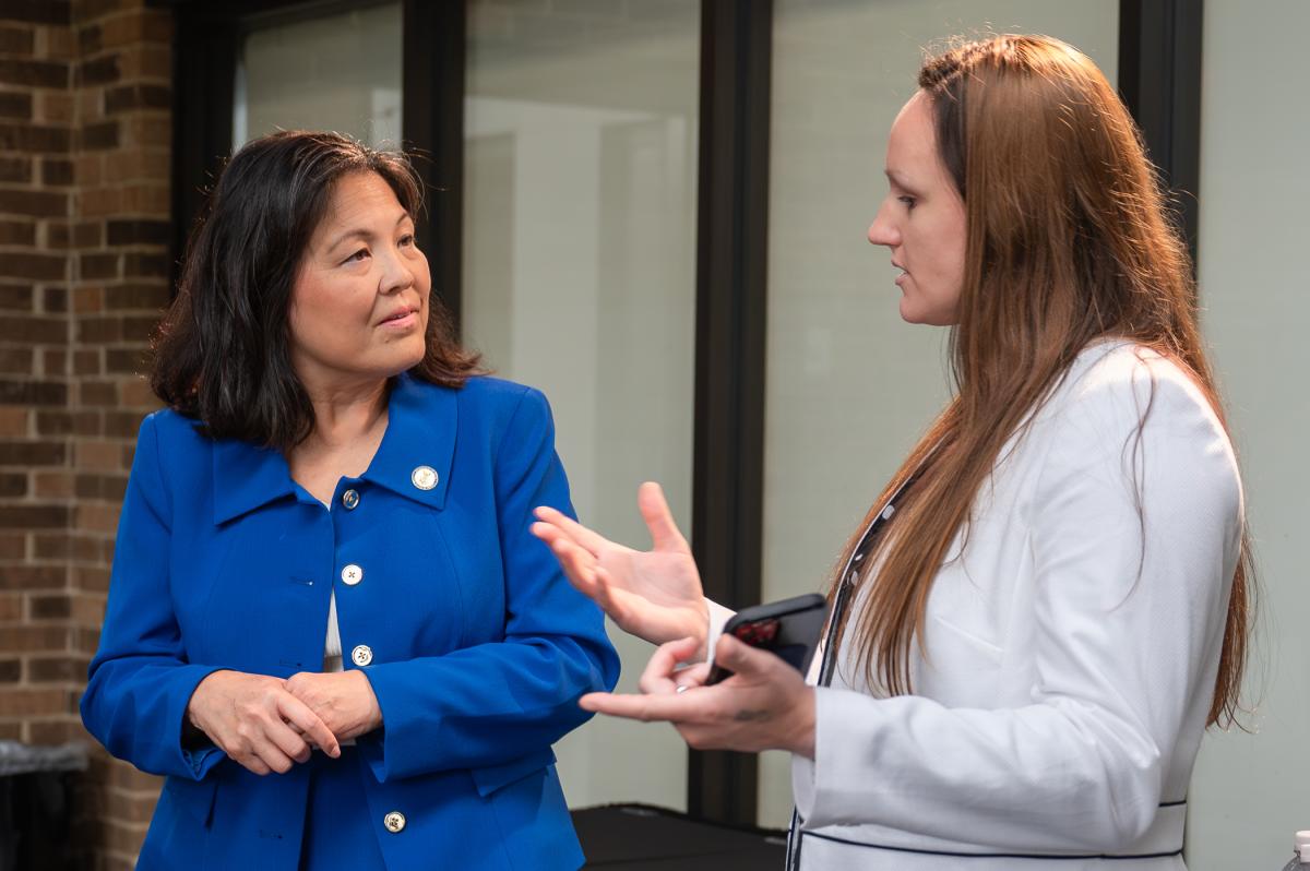 In a private moment before the announcement, Stefanie Condo, who completed Penn College’s apprenticeship program, meets with Su.