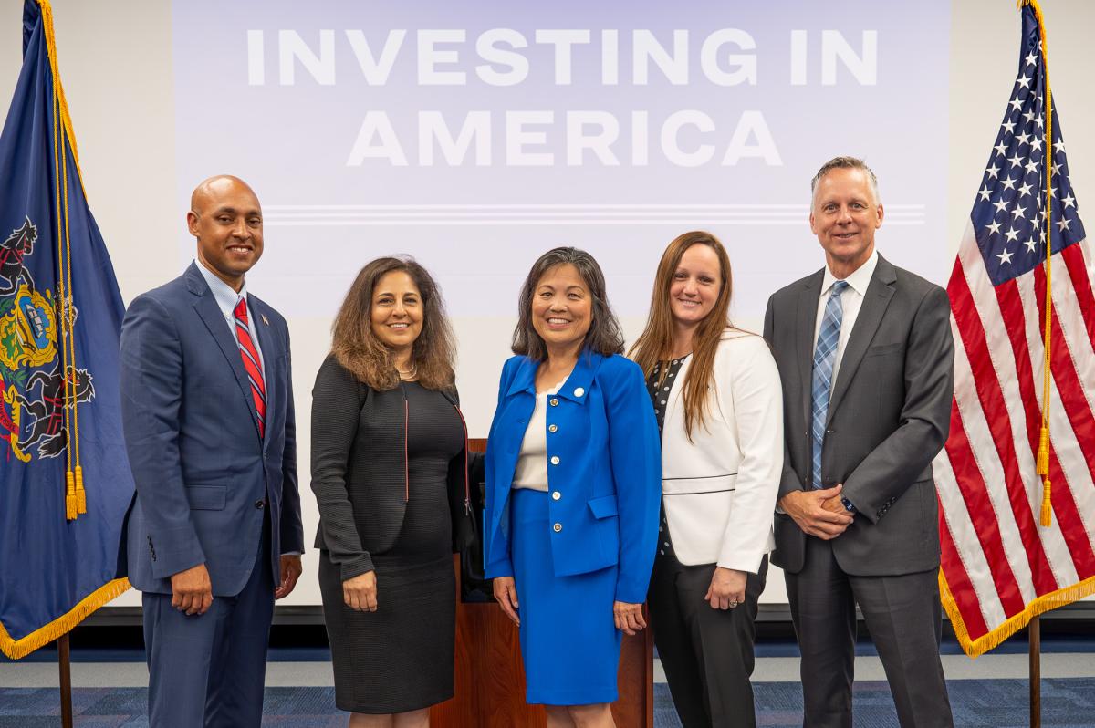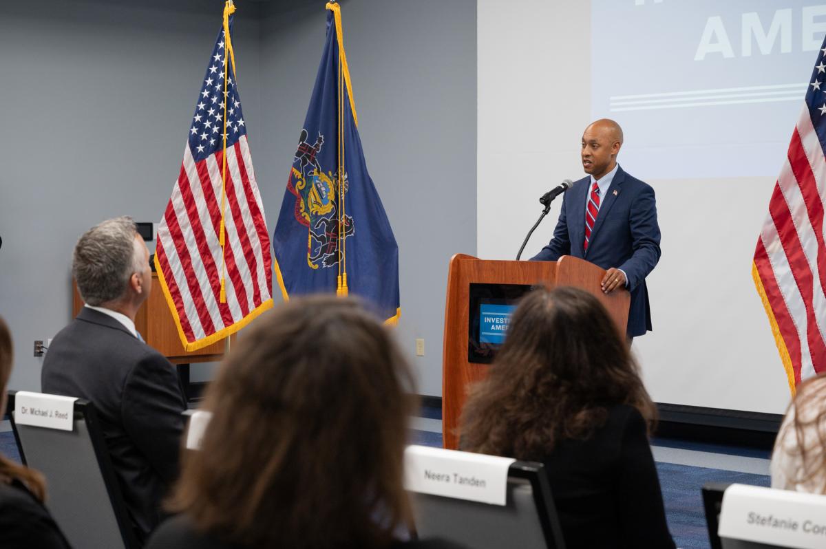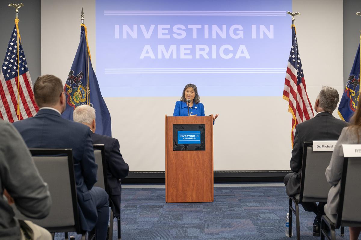 The Apprenticeship Building America grant – one of 43 totaling $195 million nationwide in a second round of funding, and the only one in Pennsylvania – was announced today during a U.S. Department of Labor event held on Penn College’s main campus. The event, offered for grant partners, elected officials, dignitaries and news media, featured remarks delivered by Julie Su, acting secretary of labor, and Neera Tanden, White House domestic policy advisor and director of the Domestic Policy Council.