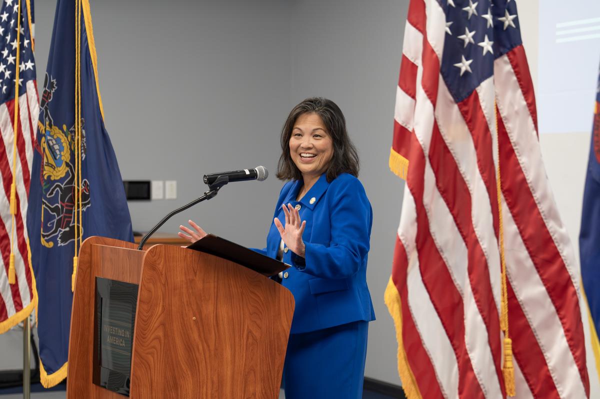 Acting U.S. Secretary of Labor Julie Su provides remarks during a U.S. Department of Labor apprenticeship announcement at Pennsylvania College of Technology on July 11.