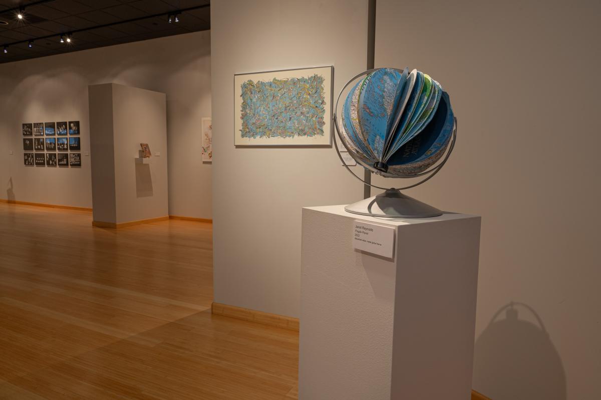 "Fragile Planet," by Janet Reynolds (on the pedestal), and Laura J. Stein's "Blue Field no. 2" (hanging on the wall) grace the gallery.