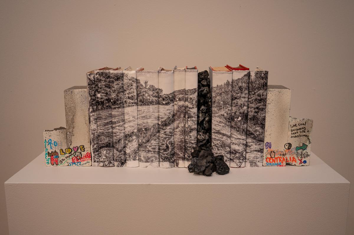 Coal spills between books in Michael Hower's "On the Road," a work also combining digital photographs, books, concrete and paint.